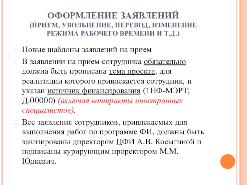 Все заявления сотрудников, привлекаемых для выполнения работ по программе ФИ, должны быть завизированы директором ЦФИ А.В. Косыгиной и подписаны курирующим проректором М.М. Юдкевич.