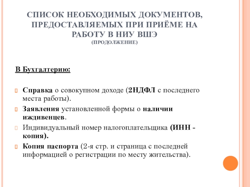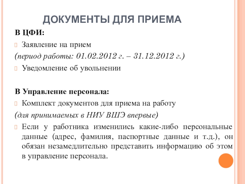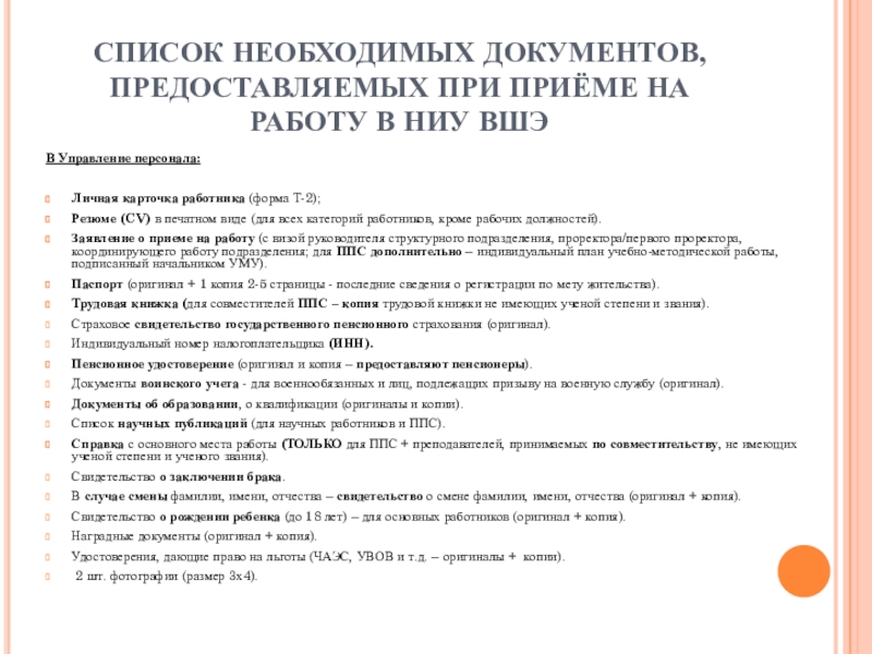 Слайд 12СПИСОК НЕОБХОДИМЫХ ДОКУМЕНТОВ, ПРЕДОСТАВЛЯЕМЫХ ПРИ ПРИЁМЕ НА РАБОТУ В НИУ ВШЭ