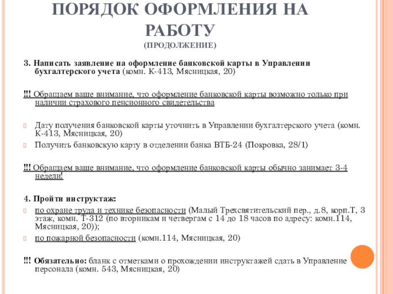 Дату получения банковской карты уточнить в Управлении бухгалтерского учета (комн. К-413, Мясницкая, 20)