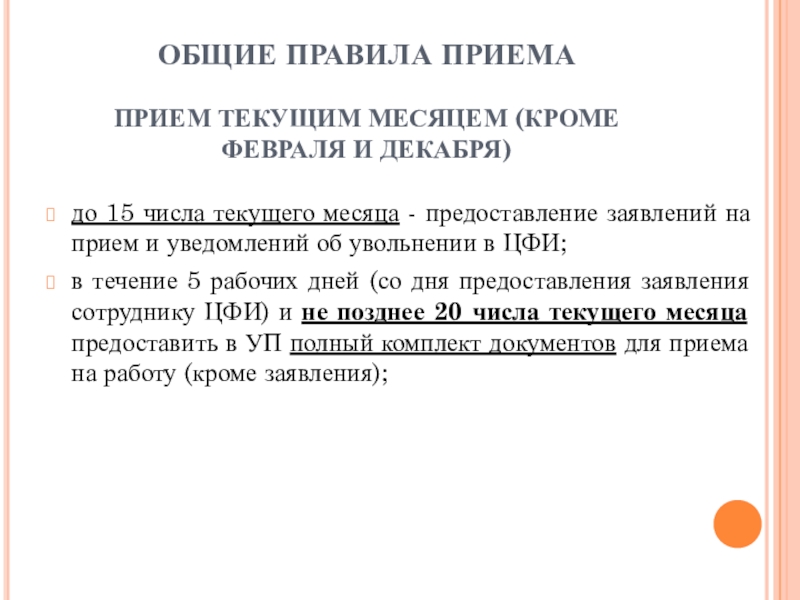 текущего месяца - предоставление заявлений на прием и уведомлений об увольнении в ЦФИ;