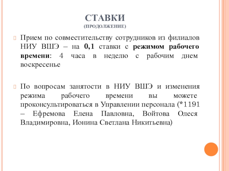 По вопросам занятости в НИУ ВШЭ и изменения режима рабочего времени вы можете проконсультироваться в Управлении персонала (*1191 – Ефремова Елена Павловна, Войтова Олеся Владимировна, Ионина Светлана Никитьевна)