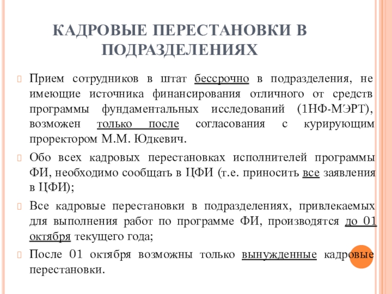 Все кадровые перестановки в подразделениях, привлекаемых для выполнения работ по программе ФИ, производятся до 01 октября текущего года;