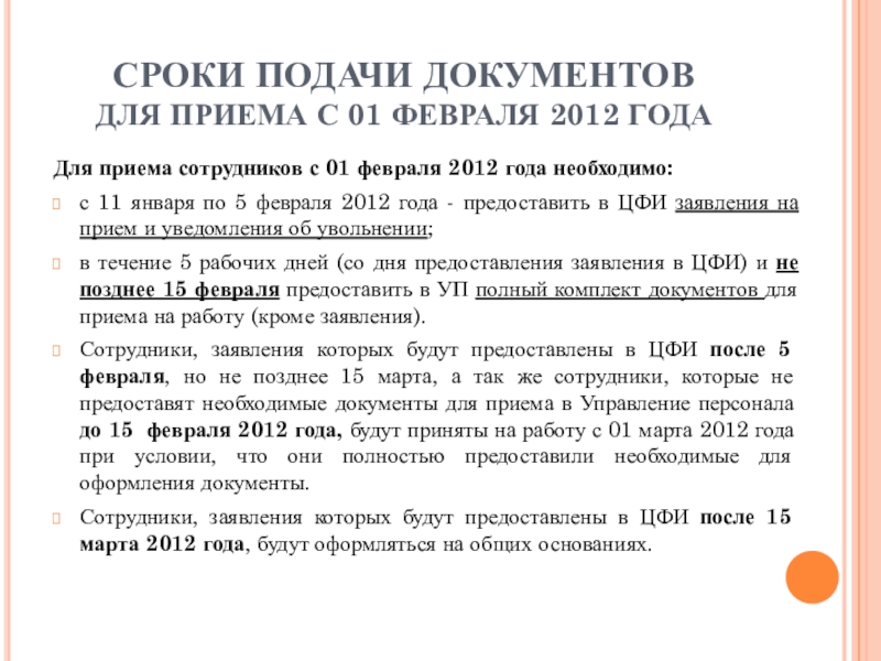 Сотрудники, заявления которых будут предоставлены в ЦФИ после 5 февраля, но не позднее 15 марта, а так же сотрудники, которые не предоставят необходимые документы для приема в Управление персонала до 15 февраля 2012 года, будут приняты на работу с 01 марта 2012 года при условии, что они полностью предоставили необходимые для оформления документы.