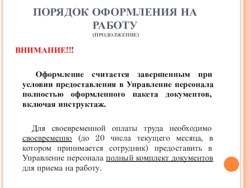 Для своевременной оплаты труда необходимо своевременно (до 20 числа текущего месяца, в котором принимается сотрудник) предоставить в Управление персонала полный комплект документов для приема на работу.