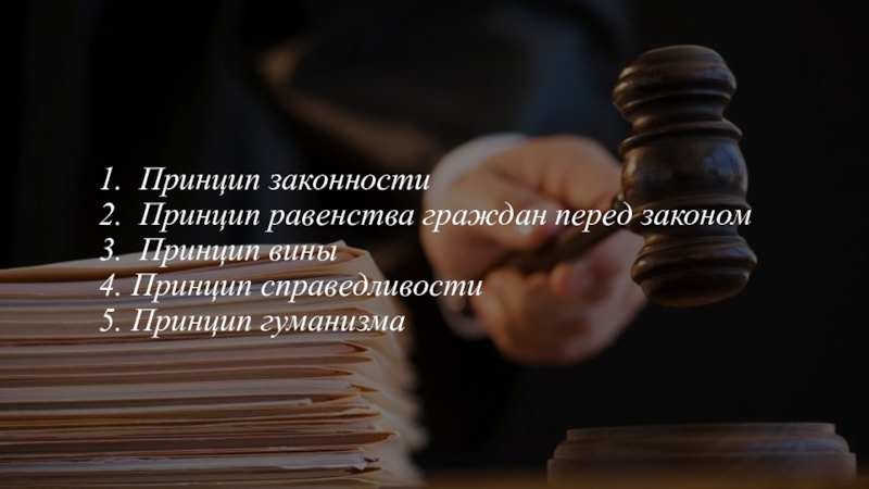 Слайд 91.  Принцип законности  2.  Принцип равенства граждан перед законом  3.  Принцип вины  4. Принцип справедливости  5. Принцип гуманизма