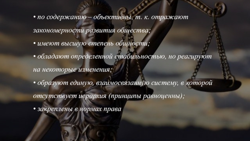 • по содержанию – объективны, т. к. отражают закономерности развития общества; • имеют высшую степень общности; • обладают определенной стабильностью, но