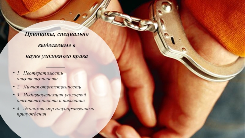 Принципы, специально выделяемые в науке уголовного права 1.  Неотвратимость ответственности2.  Личная ответственность 3.  Индивидуализация уголовной ответственности и наказания 4.  Экономия мер государственного принуждения