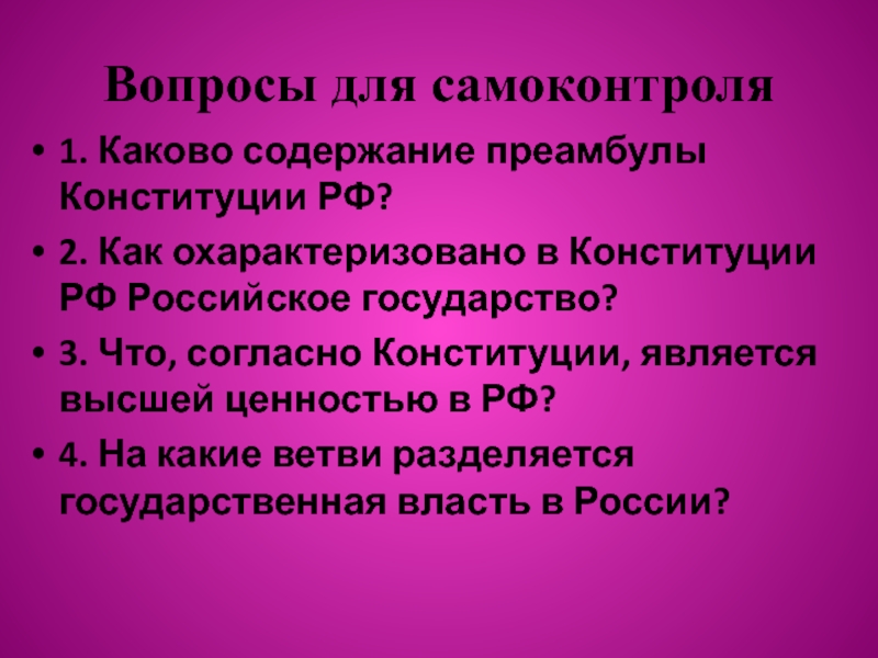 1. Каково содержание преамбулы Конституции РФ?