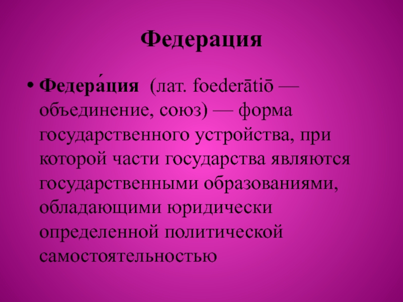 Федера́ция (лат. foederātiō — объединение, союз) — форма государственного устройства, при