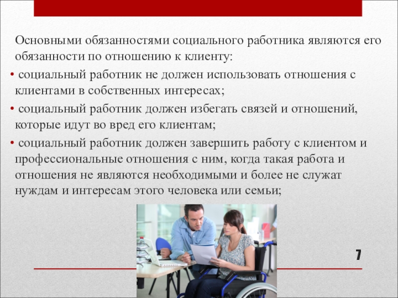 Слайд 7Основными обязанностями социального работника являются его обязанности по отношению к клиенту: