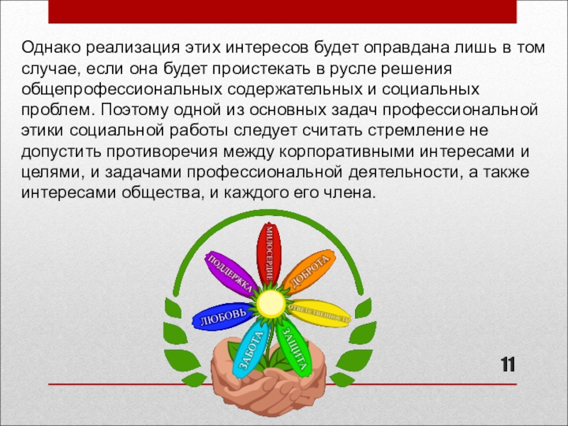 она будет проистекать в русле решения общепрофессиональных содержательных и социальных проблем. Поэтому одной из основных задач профессиональной этики социальной работы следует считать стремление не допустить противоречия между корпоративными интересами и целями, и задачами профессиональной деятельности, а также интересами общества, и каждого его члена.