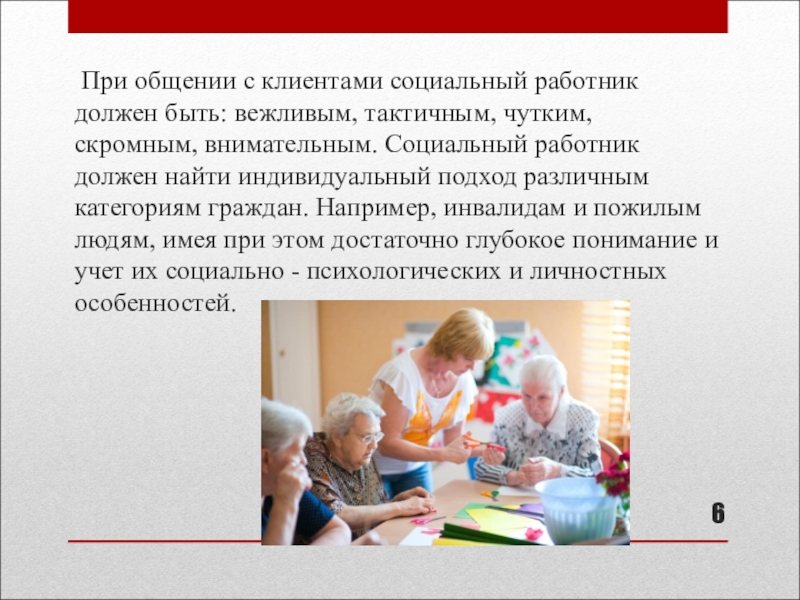Слайд 6 При общении с клиентами социальный работник должен быть: вежливым, тактичным,