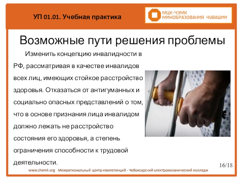 Изменить концепцию инвалидности в РФ, рассматривая в качестве инвалидов всех лиц, имеющих стойкое расстройство здоровья. Отказаться от антигуманных и социально опасных представлений о том, что в основе признания лица инвалидом должно лежать не расстройство состояния его здоровья, а степень ограничения способности к трудовой деятельности.