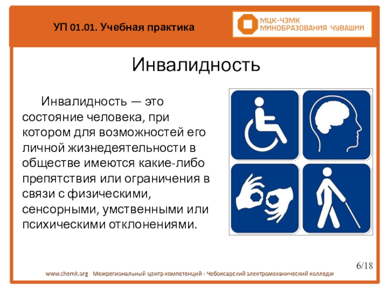 Инвалидность — это состояние человека, при котором для возможностей его личной жизнедеятельности в обществе имеются какие-либо препятствия или ограничения в связи с физическими, сенсорными, умственными или психическими отклонениями.