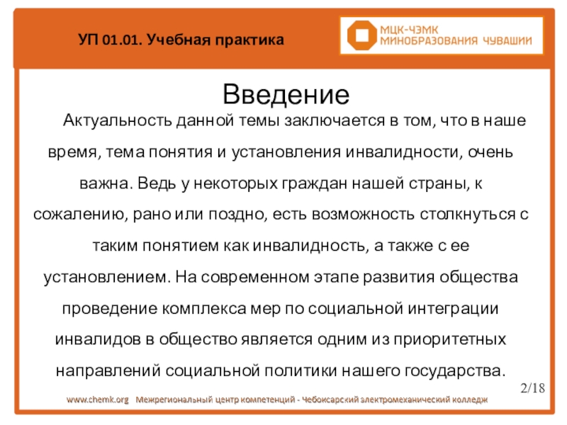 Актуальность данной темы заключается в том, что в наше время, тема понятия и установления инвалидности, очень важна. Ведь у некоторых граждан нашей страны, к сожалению, рано или поздно, есть возможность столкнуться с таким понятием как инвалидность, а также с ее установлением. На современном этапе развития общества проведение комплекса мер по социальной интеграции инвалидов в общество является одним из приоритетных направлений социальной политики нашего государства.