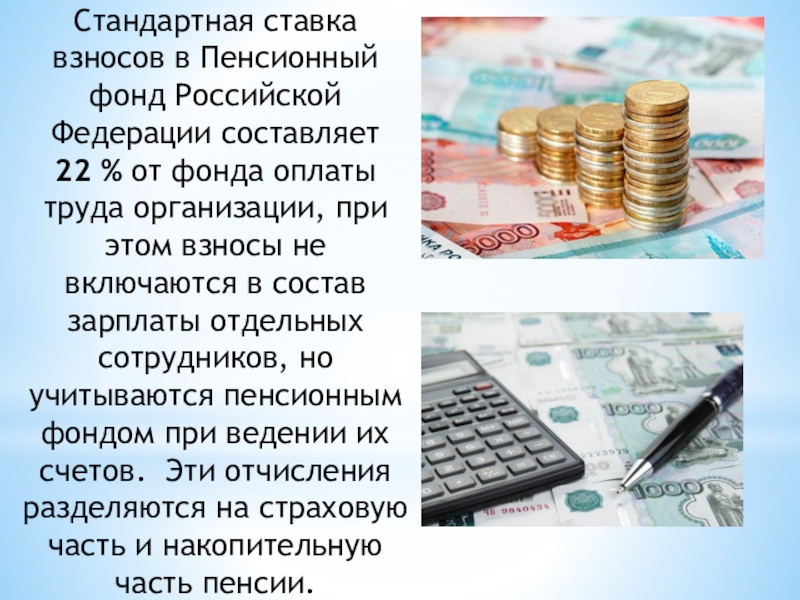 Слайд 12Стандартная ставка взносов в Пенсионный фонд Российской Федерации составляет
