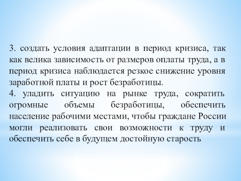 Слайд 203. создать условия адаптации в период кризиса, так как велика зависимость