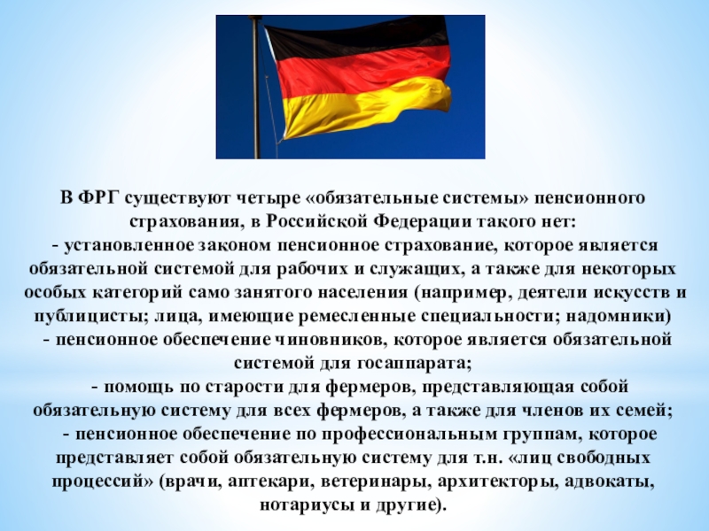 Слайд 17В ФРГ существуют четыре «обязательные системы» пенсионного страхования, в Российской Федерации