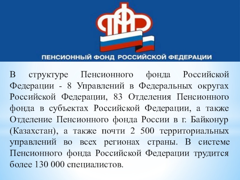 округах Российской Федерации, 83 Отделения Пенсионного фонда в субъектах Российской Федерации, а также Отделение Пенсионного фонда России в г. Байконур (Казахстан), а также почти 2 500 территориальных управлений во всех регионах страны. В системе Пенсионного фонда Российской Федерации трудится более 130 000 специалистов.