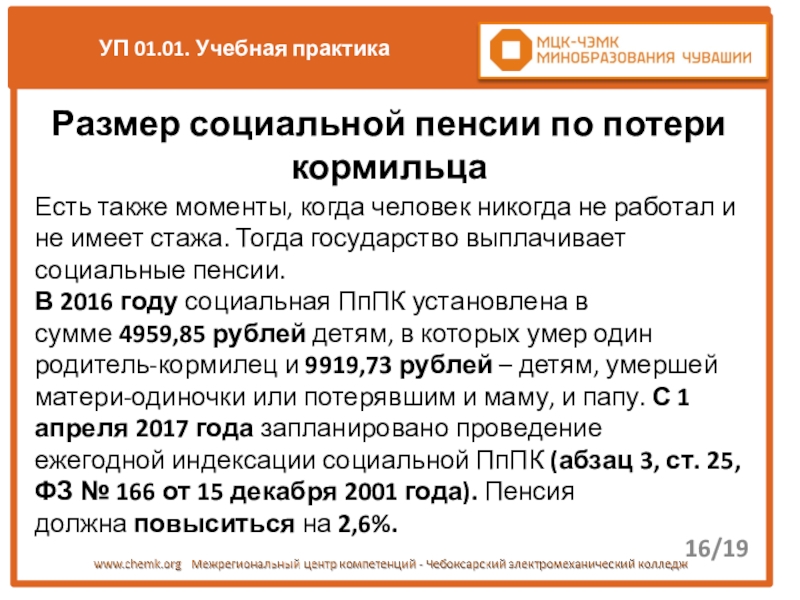 В 2016 году социальная ПпПК установлена в сумме 4959,85 рублей детям, в которых умер один родитель-кормилец и 9919,73 рублей – детям, умершей матери-одиночки или потерявшим и маму, и папу. С 1 апреля 2017 года запланировано проведение ежегодной индексации социальной ПпПК (абзац 3, ст. 25, ФЗ № 166 от 15 декабря 2001 года). Пенсия должна повыситься на 2,6%.