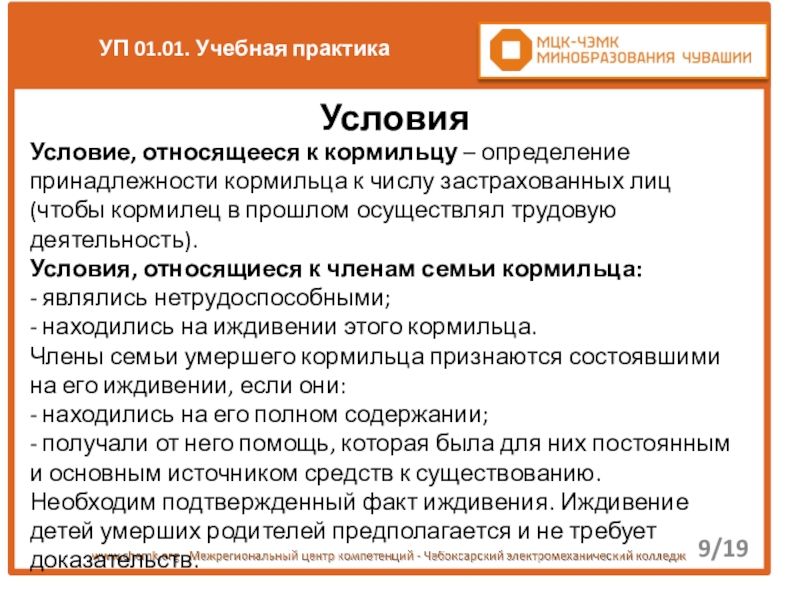 Условие, относящееся к кормильцу – определение принадлежности кормильца к числу застрахованных лиц (чтобы кормилец в прошлом осуществлял трудовую деятельность).