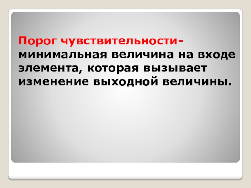 Слайд 5Порог чувствительности- минимальная величина на входе элемента, которая вызывает изменение выходной