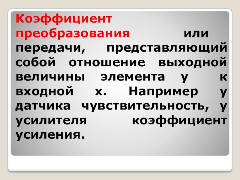 Слайд 2Коэффициент преобразования или передачи, представляющий собой отношение выходной величины элемента у