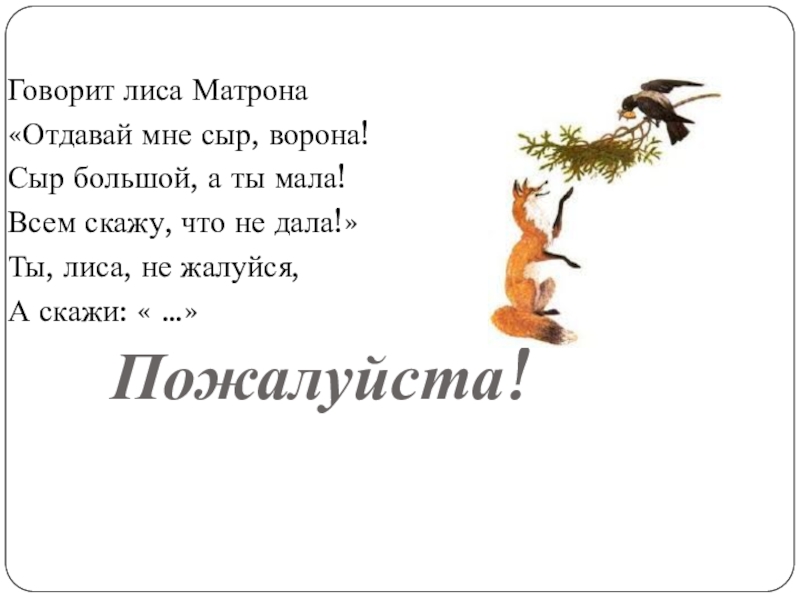 Говорит лиса Матрона«Отдавай мне сыр, ворона!Сыр большой, а ты мала!Всем скажу, что не дала!»Ты, лиса, не жалуйся,А
