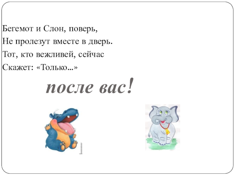 Бегемот и Слон, поверь,Не пролезут вместе в дверь.Тот, кто вежливей, сейчасСкажет: «Только…»после вас!