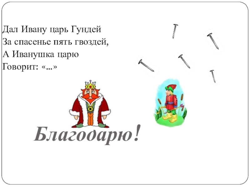 Дал Ивану царь ГундейЗа спасенье пять гвоздей,А Иванушка царюГоворит: «…»Благодарю!