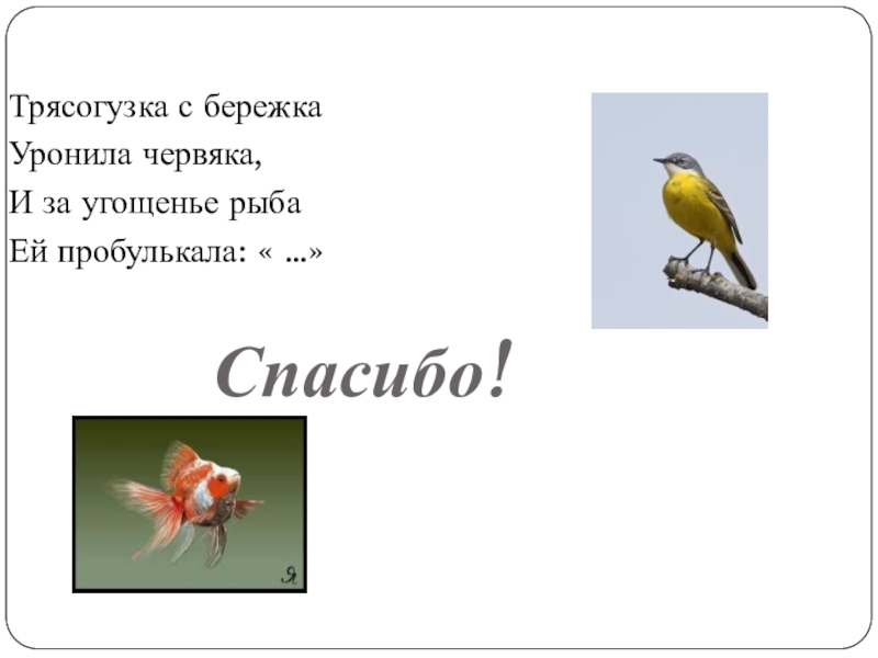 Трясогузка с бережкаУронила червяка,И за угощенье рыбаЕй пробулькала: « …»Спасибо!
