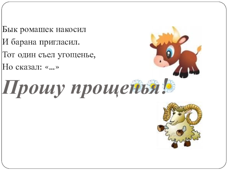 Бык ромашек накосилИ барана пригласил.Тот один съел угощенье,Но сказал: «…»Прошу прощенья!