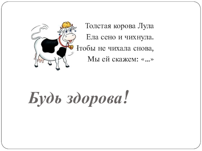 Толстая корова ЛулаЕла сено и чихнула.Чтобы не чихала снова,Мы ей скажем: «…»Будь здорова!