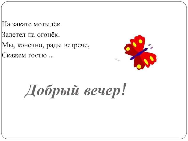 На закате мотылёкЗалетел на огонёк.Мы, конечно, рады встрече,Скажем гостю …Добрый вечер!