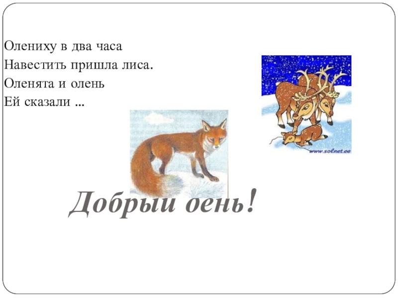 Олениху в два часаНавестить пришла лиса.Оленята и оленьЕй сказали …Добрый день!