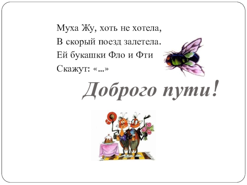 Муха Жу, хоть не хотела,В скорый поезд залетела.Ей букашки Фло и ФтиСкажут: «…»Доброго пути!