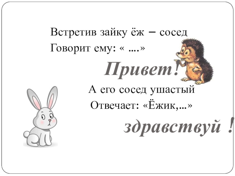 Встретив зайку ёж – соседГоворит ему: « ….»Привет!А его сосед ушастыйОтвечает: «Ёжик,…»здравствуй !