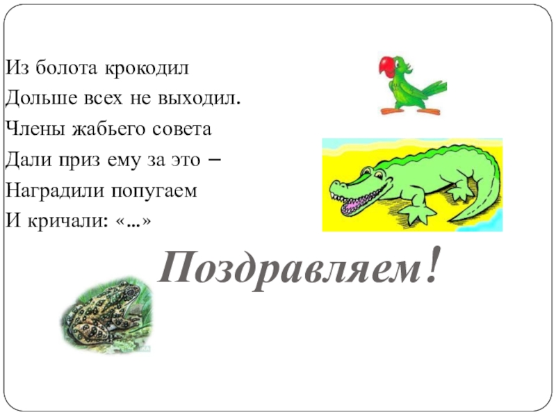 Из болота крокодилДольше всех не выходил.Члены жабьего советаДали приз ему за это –Наградили попугаемИ кричали: «…»Поздравляем!