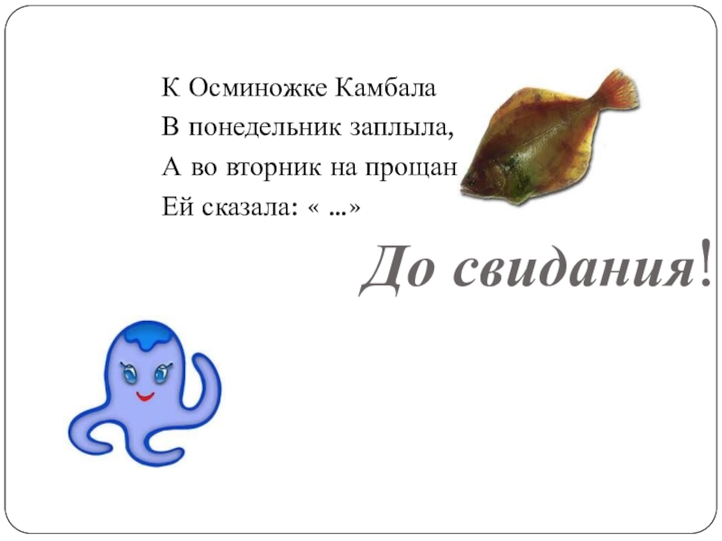 К Осминожке КамбалаВ понедельник заплыла,А во вторник на прощаньеЕй сказала: « …»До свидания!