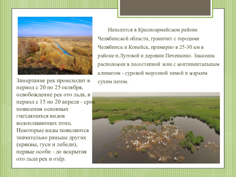 Замерзание рек происходит в период с 20 по 25 октября, освобождение рек ото льда, в период с 15 по 20 апреля - срок появления основных гнездящихся видов водоплавающих птиц. Некоторые виды появляются значительно раньше других (кряквы, гуси и лебеди), первые особи - до вскрытия ото льда рек и озёр.