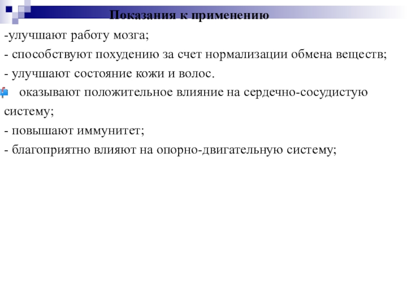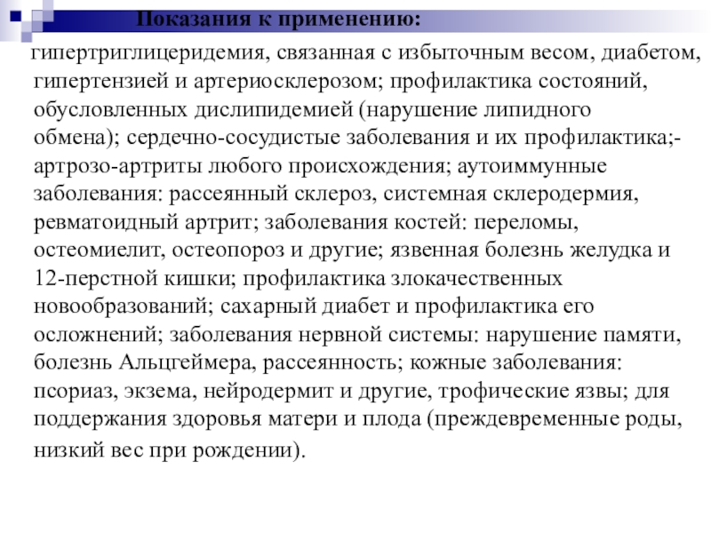 гипертриглицеридемия, связанная с избыточным весом, диабетом, гипертензией и артериосклерозом; профилактика состояний, обусловленных дислипидемией (нарушение липидного обмена); сердечно-сосудистые заболевания и их профилактика;- артрозо-артриты любого происхождения; аутоиммунные заболевания: рассеянный склероз, системная склеродермия, ревматоидный артрит; заболевания костей: переломы, остеомиелит, остеопороз и другие; язвенная болезнь желудка и 12-перстной кишки; профилактика злокачественных новообразований; сахарный диабет и профилактика его осложнений; заболевания нервной системы: нарушение памяти, болезнь Альцгеймера, рассеянность; кожные заболевания: псориаз, экзема, нейродермит и другие, трофические язвы; для поддержания здоровья матери и плода (преждевременные роды, низкий вес при рождении).