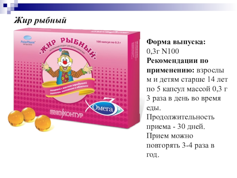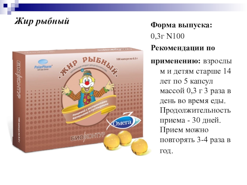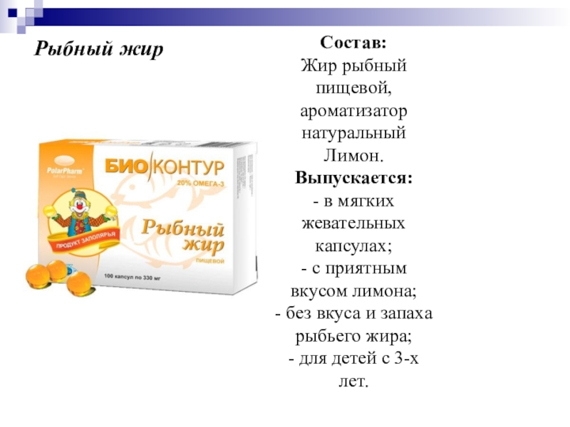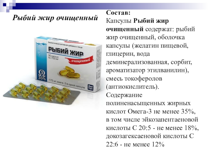 Капсулы Рыбий жир очищенный содержат: рыбий жир очищенный, оболочка капсулы (желатин пищевой,