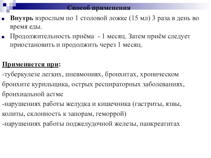 Внутрь взрослым по 1 столовой ложке (15 мл) 3 раза в день во время еды.