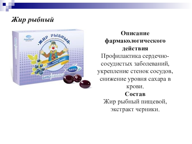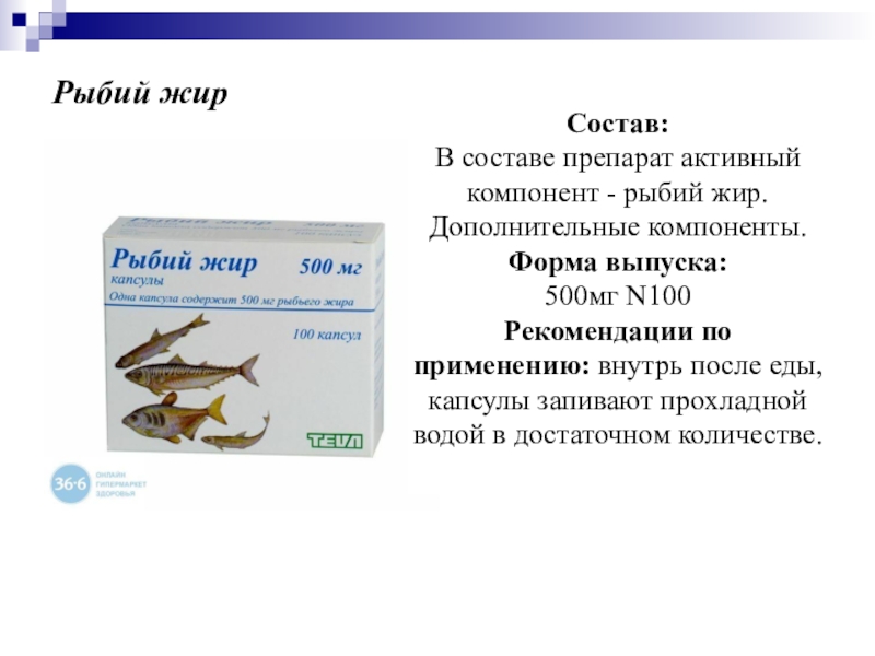 В составе препарат активный компонент - рыбий жир. Дополнительные компоненты.