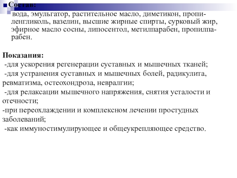 высшие жирные спирты, сурковый жир, эфирное масло сосны, липосентол, метилпарабен, пропилпа-рабен.