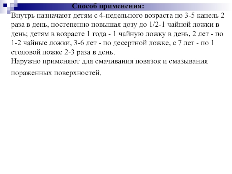 Внутрь назначают детям с 4-недельного возраста по 3-5 капель 2 раза в день, постепенно повышая дозу до 1/2-1 чайной ложки в день; детям в возрасте 1 года - 1 чайную ложку в день, 2 лет - по 1-2 чайные ложки, 3-6 лет - по десертной ложке, с 7 лет - по 1 столовой ложке 2-3 раза в день.