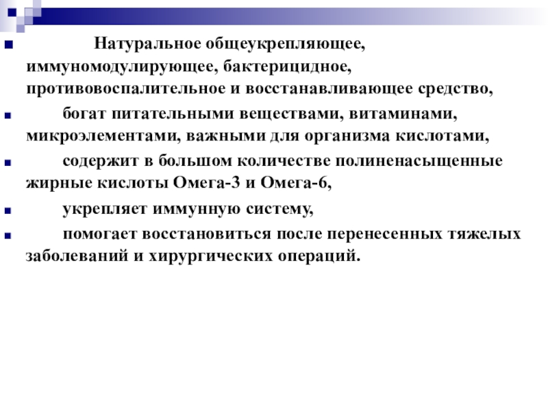 Слайд 26 Натуральное общеукрепляющее, иммуномодулирующее, бактерицидное, противовоспалительное и восстанавливающее средство,