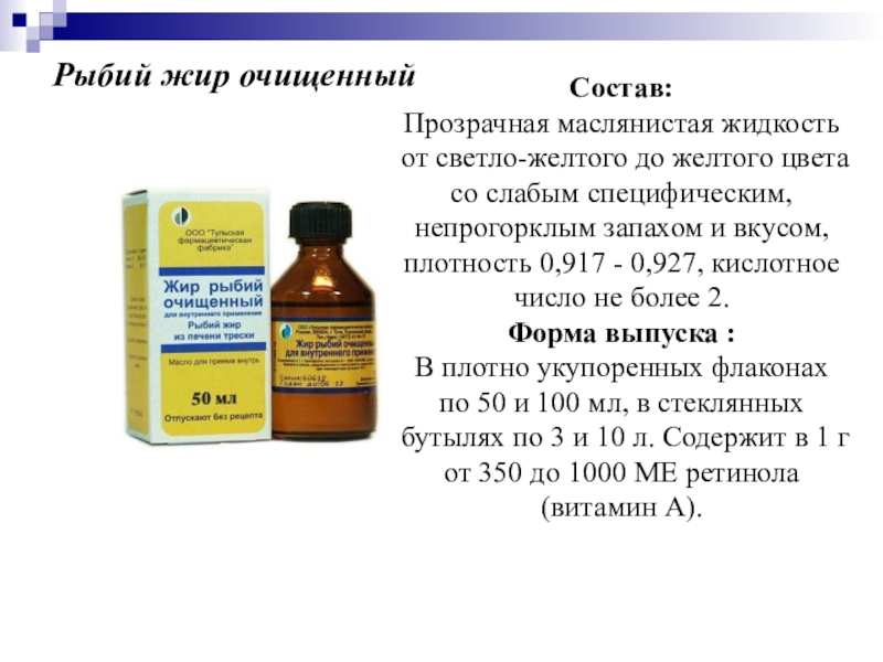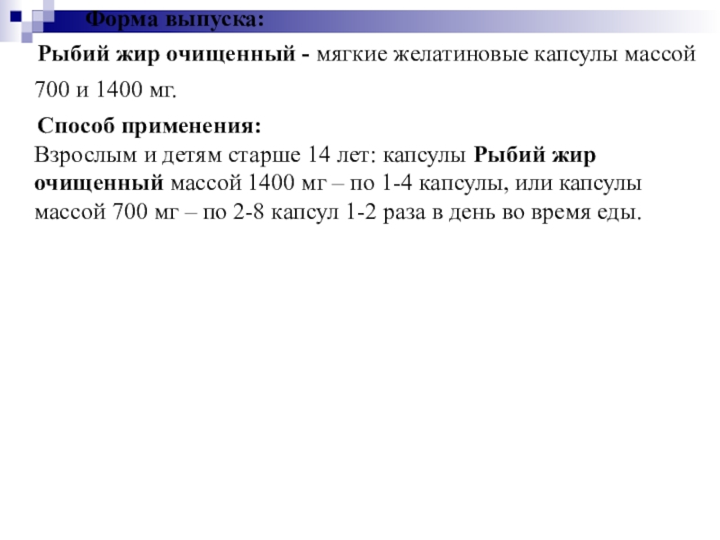 Рыбий жир очищенный - мягкие желатиновые капсулы массой 700 и 1400 мг.