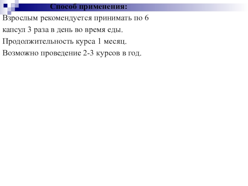 по 5 капсул массой 0,3 г 3 раза в день во время еды. Продолжительность приема - 30 дней. Прием можно повторять 3-4 раза в год.