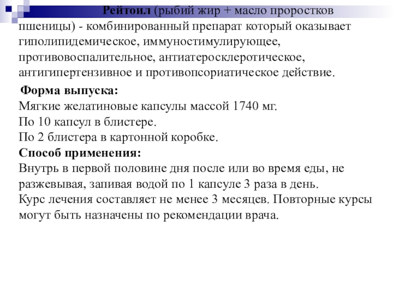 Рейтоил (рыбий жир + масло проростков пшеницы) - комбинированный препарат который оказывает гиполипидемическое, иммуностимулирующее, противовоспалительное, антиатеросклеротическое, антигипертензивное и противопсориатическое действие.